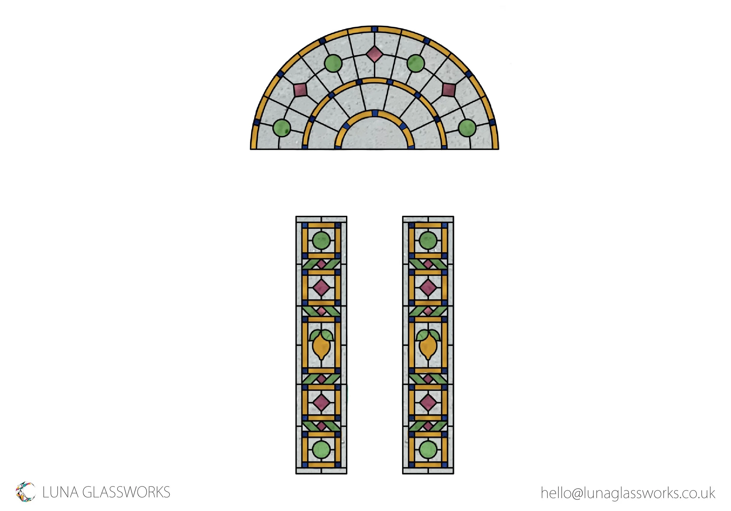 My client’s home was originally built in 1875 and was inhabited by the founder of ‘‘The Old Lemonade Factory’’ opposite. I couldn’t resist including a little lemon tribute within this traditional Victorian stained glass entrance set. This project was completed in two stages, the fanlight first - followed by the door panels which have been encapsulated into sealed units.