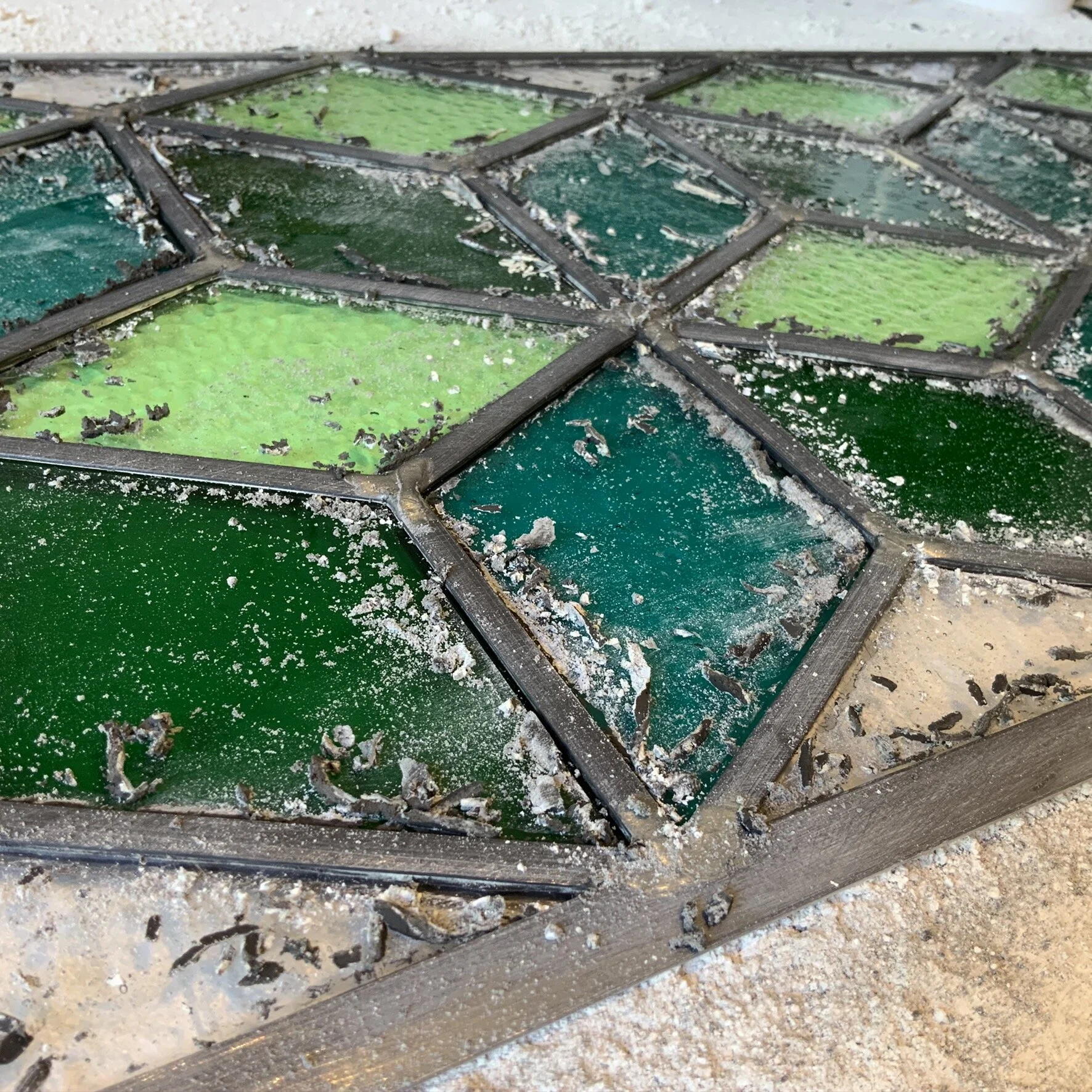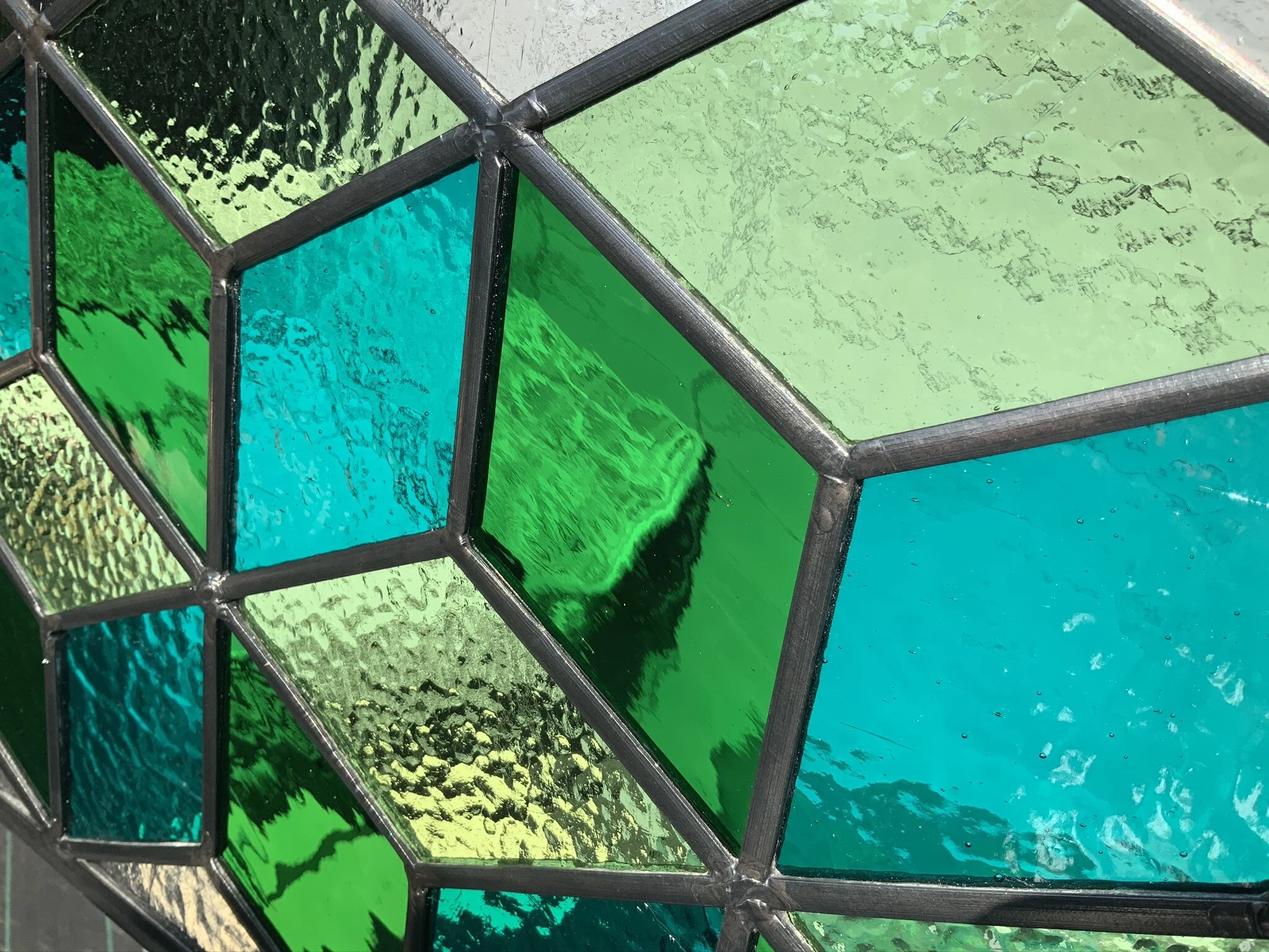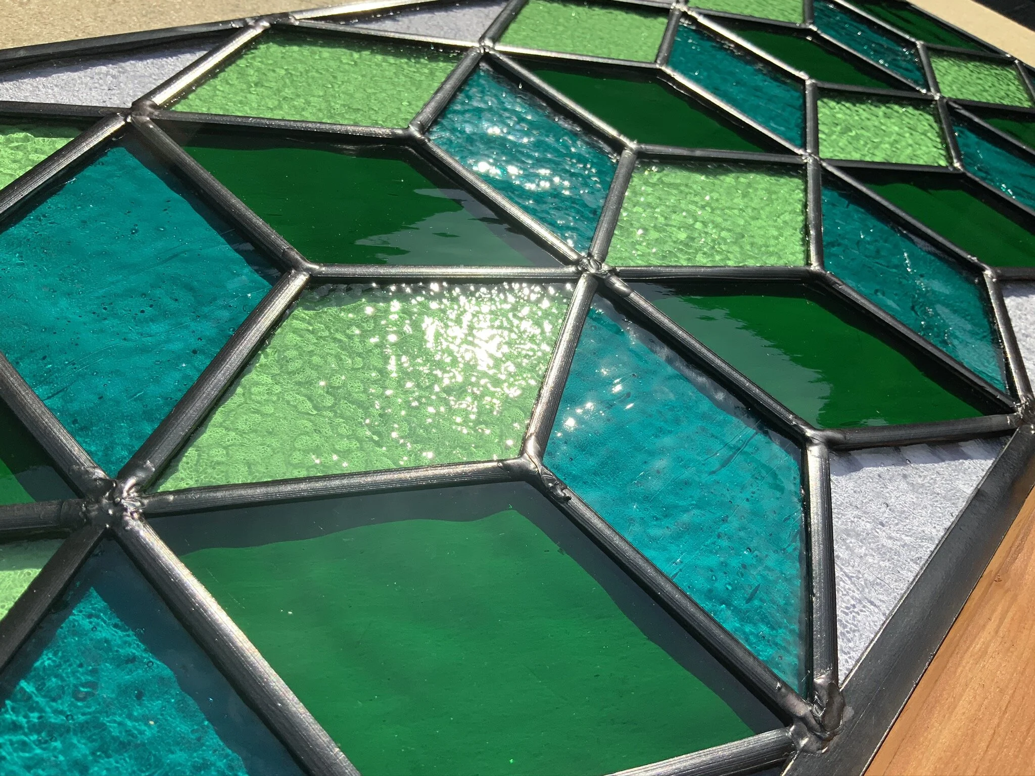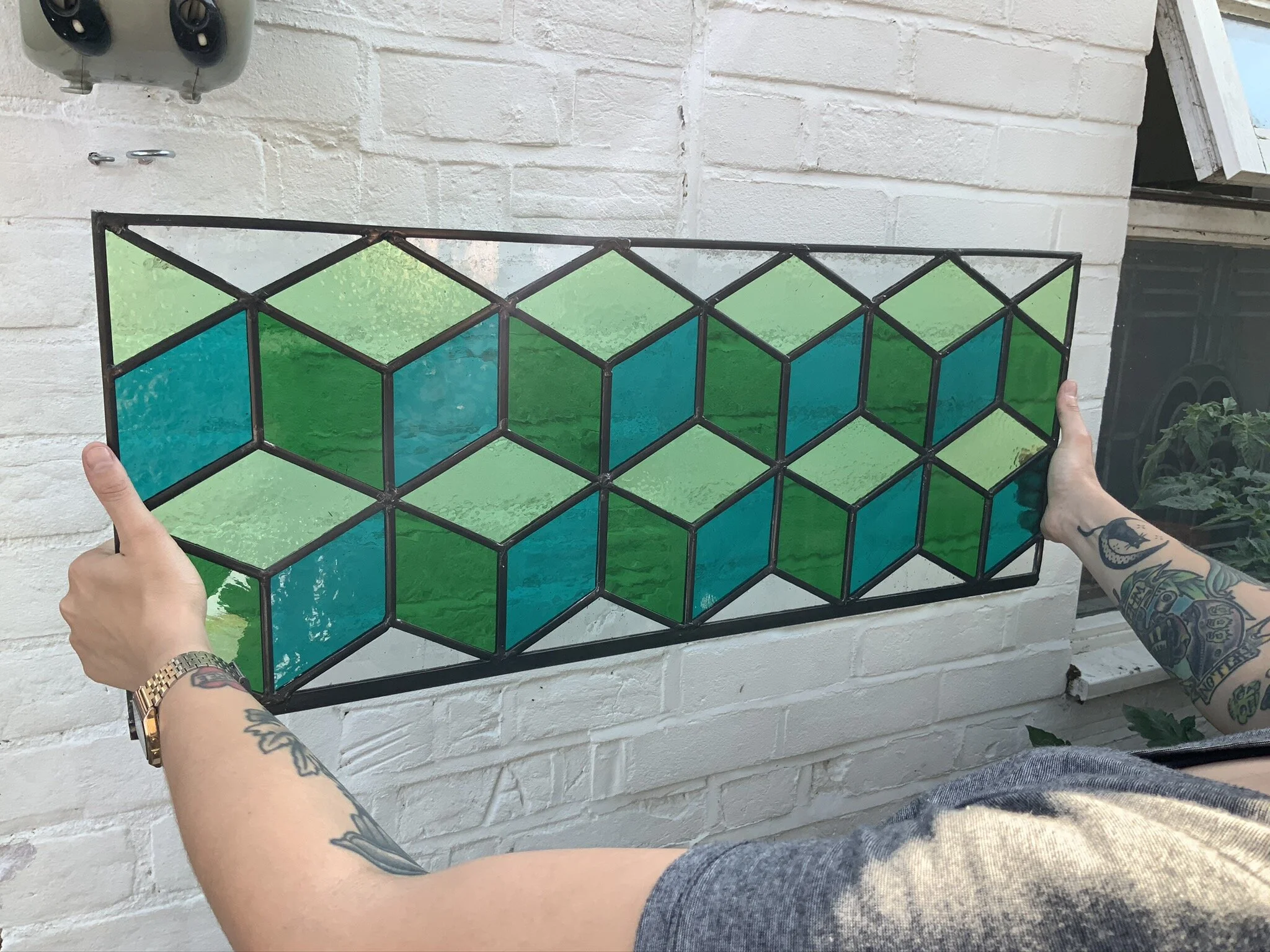 I loved making this Custom geometric Top light to go above a victorian front door in London. I worked with the client to create these striking cube shapes in bold colours, and the window makes a great addition to the hallway.
